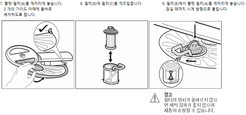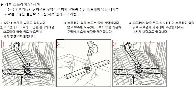 | A | 좋은 세척 성능을 유지하기 위해서는 필터와 회전 날개를 정기적으로 청소해 주시는 것이 중요합니다. 필터가 더럽거나 회전 날개가 막혀 있을 경우, 세척력이 떨어지거나 냄새가 발생할 수 있습니다. ※ 필터 및 회전 날개, 내·외장 청소 관리 방법을 참고해 주세요.